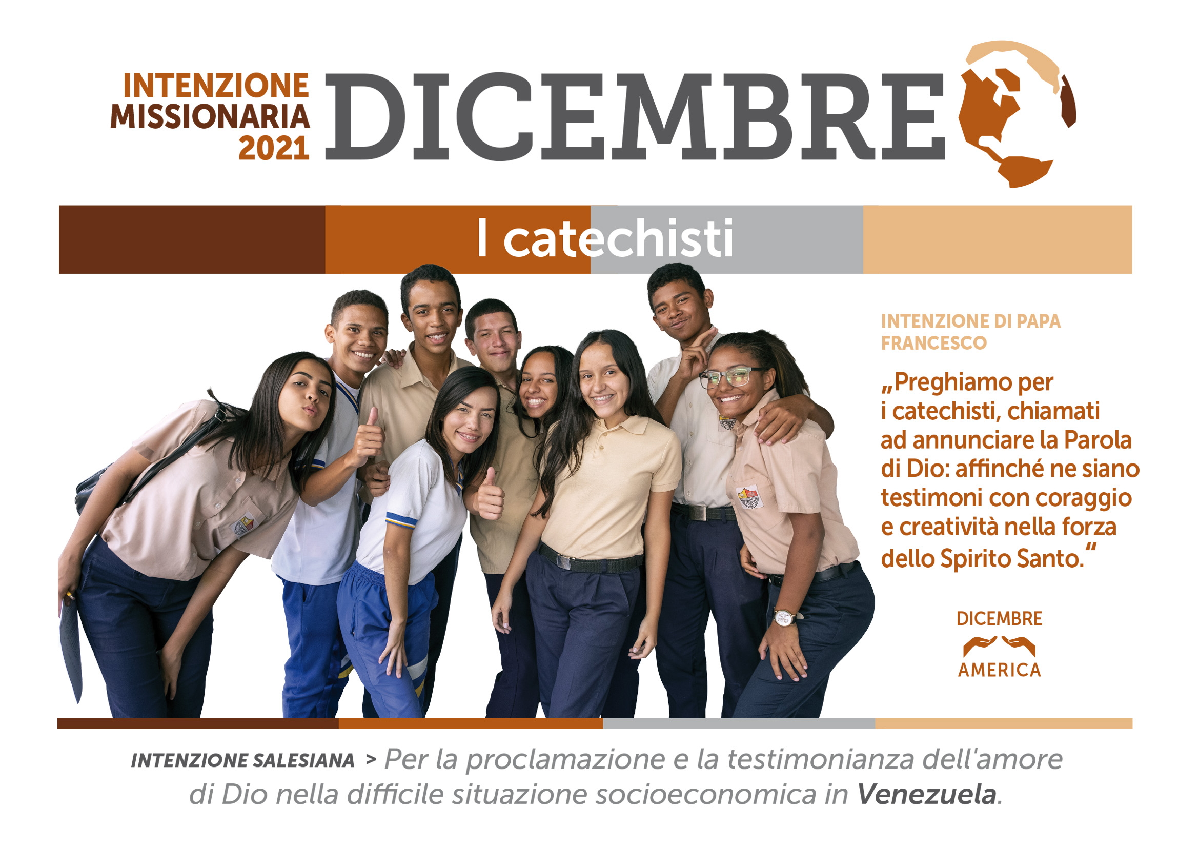 Per la proclamazione e la testimonianza dell'amore di Dio nella difficile situazione socioeconomica in Venezuela. Preghiamo per i catechisti, chiamati ad annunciare la Parola di Dio: affinché ne siano testimoni con coraggio e creatività nella forza dello Spirito Santo.