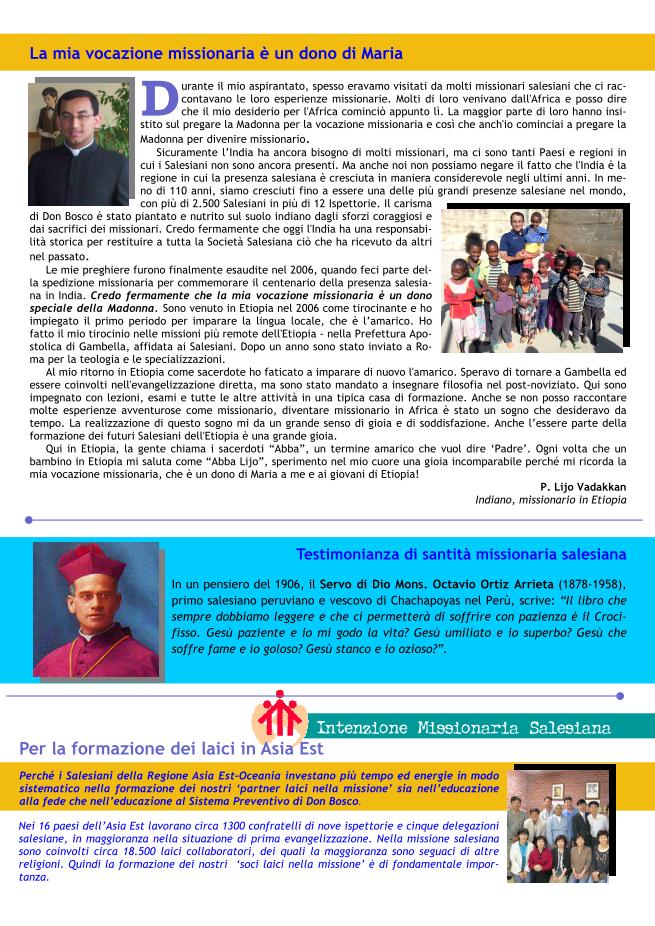 D urante il mio aspirantato, spesso eravamo visitati da molti missionari salesiani che ci raccontavano le loro esperienze missionarie. Molti di loro venivano dall'Africa e posso dire che il mio desiderio per l'Africa cominciò appunto lì. La maggior parte di loro hanno insistito sul pregare la Madonna per la vocazione missionaria e così che anch'io cominciai a pregare la Madonna per divenire missionario.