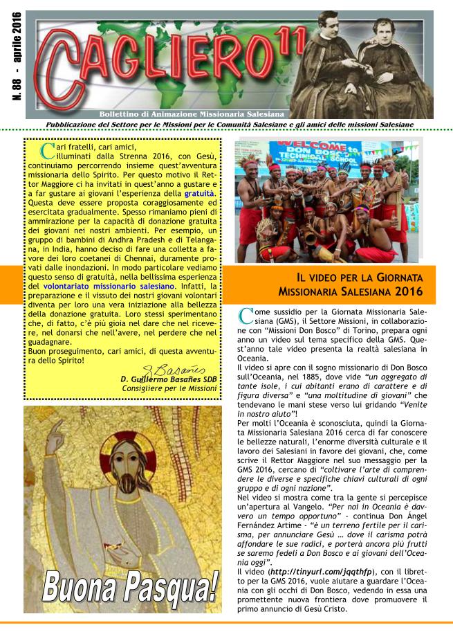 C ari fratelli, cari amici, illuminati dalla Strenna 2016, con Gesù, continuiamo percorrendo insieme quest’avventura missionaria dello Spirito. Per questo motivo il Rettor Maggiore ci ha invitati in quest’anno a gustare e a far gustare ai giovani l’esperienza della gratuità.