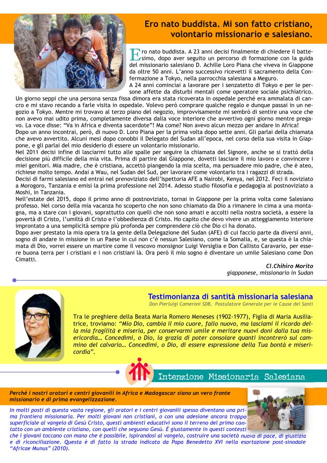 Il video (http://tinyurl.com/jqqthfp), con il libretto per la GMS 2016, vuole aiutare a guardare l’Oceania con gli occhi di Don Bosco, vedendo in essa una promettente nuova frontiera dove promuovere il primo annuncio di Gesù Cristo. E ro nato buddista. A 23 anni decisi finalmente di chiedere il battesimo, dopo aver seguito un percorso di formazione con la guida del missionario salesiano D. Achille Loro Piana che viveva in Giappone da oltre 50 anni. L’anno successivo ricevetti il sacramento della Confermazione a Tokyo, nella parrocchia salesiana a Meguro.