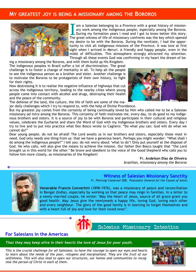 But my greatest joy comes from the certainty of being continually loved by Him who called me to be a Salesian missionary ad intra among the Bororos. This certainty of faith motivates me, every day, to do good to my indigenous brothers and sisters. It is a source of joy to be with Bororos and participate in their cultural and religious values, celebrate the Eucharist and share the Word of God with my Indigenous brothers and sisters. Every day I try to live and to put into practice what Don Bosco wrote to Cagliero: “Do what you can: God will do what we cannot do!” Dear young people, do not be afraid! The Lord awaits us in our brothers and sisters, especially those most in need. God only needs one thing from us: that we have a generous heart. Perhaps you might wonder: “What shall I do among the indigenous people?” I tell you: do not worry about ‘what to do’! Only put yourself at the disposal of God. He who calls, will also give the means to achieve the mission. Our father Don Bosco taught that “the Lord brought us in this world for the other.” Be brave and obedient to the voice of the Good Shepherd who calls you to follow him more closely, as missionaries of the Kingdom! Fr. Andelson Dias de Oliveira brazilian, missionary among the Bororos For Salesians in the Americas That they may keep alive in their hearts the love of Jesus for poor youth.