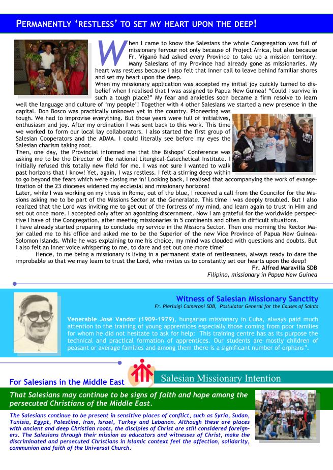 I have already started preparing to conclude my service in the Missions Sector. Then one morning the Rector Major called me to his office and asked me to be the Superior of the new Vice Province of Papua New GuineaSolomon Islands. While he was explaining to me his choice, my mind was clouded with questions and doubts. ButI also felt an inner voice whispering to me, to dare and set out one more time!Hence, to me being a missionary is living in a permanent state of restlessness, always ready to dare theimprobable so that we may learn to trust the Lord, who invites us to constantly set our hearts upon the deep!Fr. Alfred Maravilla SDBFilipino, missionary in Papua New GuineaFor Salesians in the Middle EastThat Salesians may continue to be signs of faith and hope among thepersecuted Christians of the Middle East.