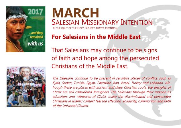 For Salesians in the Middle East That Salesians may continue to be signs of faith and hope among the persecuted Christians of the Middle East.