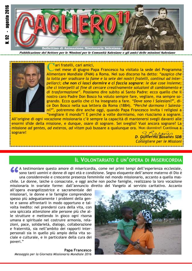 Titolo notiziario Nome società N. 92 - agosto 2016 Bollettino di Animazione Missionaria Salesiana Pubblicazione del Settore per le Missioni per le Comunità Salesiane e gli amici delle missioni Salesiane C ari fratelli, cari amici, nel mese di giugno Papa Francesco ha visitato la sede del Programma Alimentare Mondiale (PAM) a Roma. Nel suo discorso ha detto: “auspico che la lotta per sradicare la fame e la sete dei nostri fratelli, continui ad interpellarci; che non ci lasci dormire e ci faccia sognare: le due cose insieme; che ci interpelli al fine di cercare creativamente soluzioni di cambiamento e di trasformazione”. Possiamo dire subito al Santo Padre: ecco quello che il nostro caro Padre Don Bosco ha voluto sempre fare, vegliare, ma sempre sognando. Ecco quello che ci ha insegnato a fare. “Dove sono i Salesiani?”, dice Don Bosco nella sua lettera da Roma (1884). “Perché dormono i Salesiani?”, potremmo dire anche oggi, quando Papa Francesco invita i religiosi a “svegliare il mondo”! E perché a volte dormiamo, non riusciamo a sognare.