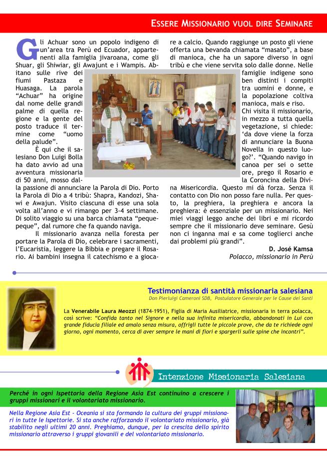IL VOLONTARIATO È UN’OPERA DI MISERICORDIAG li Achuar sono un popolo indigeno di un’area tra Perù ed Ecuador, appartenenti alla famiglia jivaroana, come gli Shuar, gli Shiwiar, gli Awajunt e i Wampis. Abitano sulle rive dei fiumi Pastaza e Huasaga. La parola “Achuar” ha origine dal nome delle grandi palme di quella regione e la gente del posto traduce il termine come “uomo della palude”.