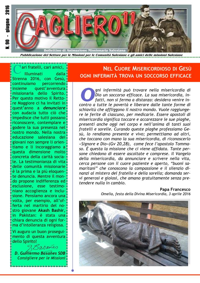 Vi auguro un buon prosegui mento di questa avventura dello Spirito! D. Guillermo Basañes SDB Consigliere per le Missioni O gni infermità può trovare nella misericordia di Dio un soccorso efficace. La sua misericordia, in fatti, non si ferma a distanza: desidera venire in contro a tutte le povertà e liberare dalle tante forme di schiavitù che affliggono il nostro mondo. Vuole raggiunge re le ferite di ciascuno, per medicarle. Essere apostoli di misericordia significa toccare e accarezzare le sue piaghe, presenti anche oggi nel corpo e nell’anima di tanti suoi fratelli e sorelle. Curando queste piaghe professiamo Ge sù, lo rendiamo presente e vivo; permettiamo ad altri, che toccano con mano la sua misericordia, di riconoscerlo «Signore e Dio»(Gv 20,28), come fece l’apostolo Tomma so. È questa la missione che ci viene affidata. Tante per sone chiedono di essere ascoltate e comprese. Il Vangelo della misericordia, da annunciare e scrivere nella vita, cerca persone con il cuore paziente e aperto, “buoni sa maritani” che conoscono la compassione e il silenzio di nanzi al mistero del fratello e della sorella; domanda ser vi generosi e gioiosi, che amano gratuitamente senza pre tendere nulla in cambio. Papa Francesco Omelia, festa della Divina Misericordia, 3 aprile 2016 La mia vita religiosa missionaria ad gentes è iniziata in un modo simile alla chiamata di Dio nei confronti di Samuele. Con il consiglio di Eli, il bambino Samuel ha riconosciuto la chiamata di Dio per lui: “Parla, Signore, il tuo servo ti ascolta” (1Sam 3,9).