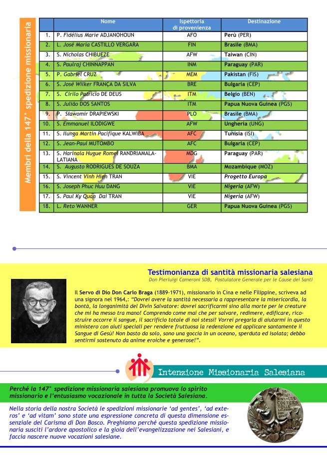 Nella storia della nostra Società le spedizioni missionarie ‘ad gentes’, ‘ad exte- ros’ e ‘ad vitam’ sono state una espressione concreta di questa dimensione es- senziale del Carisma di Don Bosco. Preghiamo perché questa spedizione missio- naria susciti l’ardore apostolico e la gioia dell’evangelizzazione nei Salesiani, e faccia nascere nuove vocazioni salesiane.