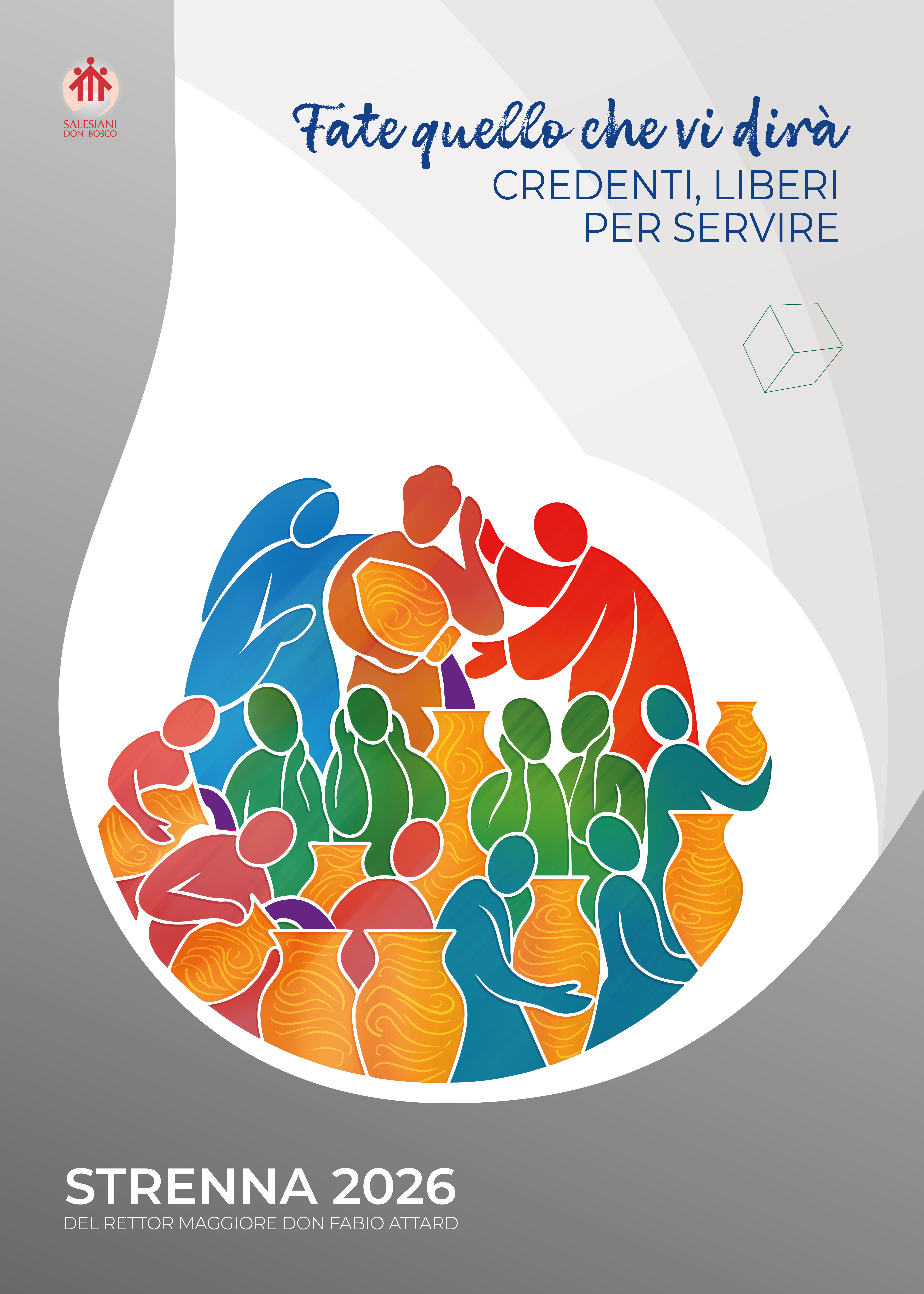 Il Poster della STRENNA 2026 dal tema “FATE QUELLO CHE VI DIRÀ” Credenti, liberi per servire, racconta visivamente il brano del VANGELO delle Nozze di Cana. Riprendendo lo schema in quattro movimenti, proposti dal Rettor Maggiore, vengono evidenziati nell’illustrazione: Maria (a sinistra) che guarda e percepisce il bisogno; rivolge questa consapevolezza a Don Bosco (al centro), che rappresenta il discernimento pieno di fede e l'azione compassionevole della missione salesiana, e insieme guardano a Gesù, che indica la via. In primo piano poi si vedono i servi che ascoltano, scelgono e infine condividono il vino trasformato dalle giare, affinché la comunità riceva l'abbondanza dei doni di Dio. I colori e la disposizione dei soggetti sottolineano la comunione, il servizio e l'attenzione: lo sguardo di Maria risveglia la consapevolezza (GUARDARE), la presenza di Cristo dà profondità e direzione (ASCOLTARE), i gesti liberi e fiduciosi dei servi rivelano il consenso interiore (SCEGLIERE) e il loro atto di portare il vino manifesta il servizio gioioso (AGIRE). Nella parte superiore della composizione, il piccolo cubo fluttuante funge da sottile provocazione, un promemoria di come a volte possiamo lasciarci confinare da paure interiori, atteggiamenti rigidi o persino da nuove ideologie e sistemi moderni che promettono progresso ma limitano silenziosamente la nostra apertura allo Spirito e alla vera libertà umana. L'intera immagine è un promemoria del fatto che quando l'amore ascolta la parola di Cristo, il cuore trova la libertà di scegliere, di servire e di condividere la gioia trasformatrice di Dio.